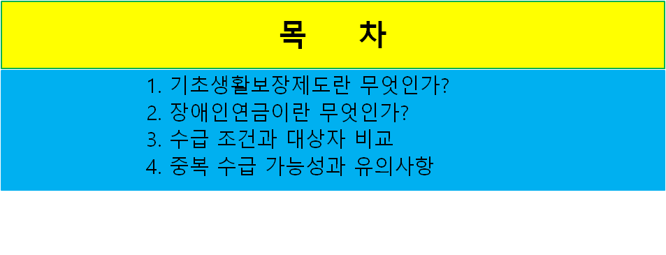 | 수급 조건 | 소득+재산, 부양의무자 없음 | 중증장애 여부 + 소득인정액 |