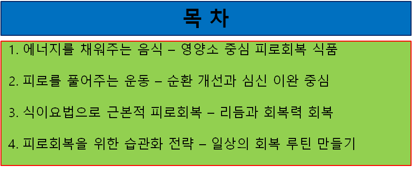 음식과 운동뿐 아니라, 생활 전반의 리듬을 회복하는 습관화가 피로해소의 핵심입니다.